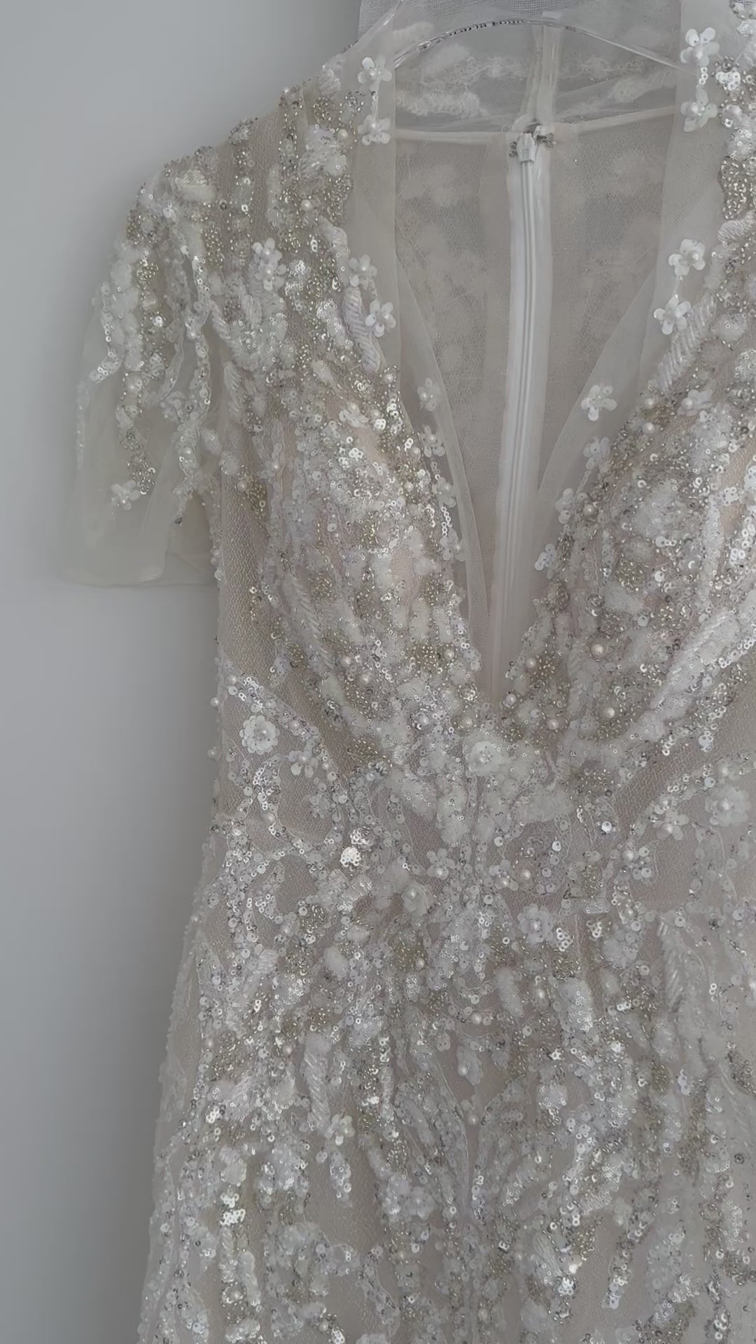 Introducing our stunning ‘ilana’ mini dress, designed to captivate with its luxurious details and romantic allure. Layers of sheer nude tulle and shimmering sparkle tulle create an ethereal allure, while intricate hand-applied beaded lace appliqués adorn the surface, elevating its beauty to unparalleled levels. A plunge neckline with built-in breast cups ensures comfortable support and a flawless silhouette. The sheer short sleeves embellished with matching beaded appliqués. The back of the dress features an invisible zipper, complemented by clear bead buttons that elegantly fasten around the neck. This dress is the epitome of glamour and elegance, perfect for making a memorable entrance.